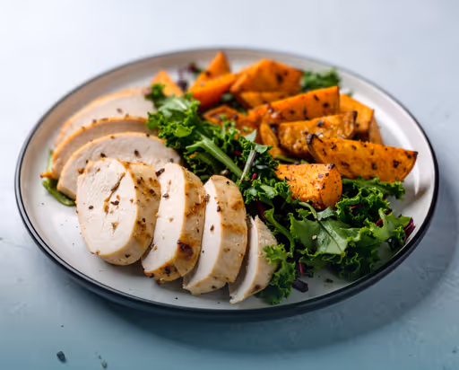 A fehérjedús rostonsült csirkemell szeletek sütőben sült édesburgonya szeletekkel és friss salátalevekkel egy tiszta, egyszerű diétás étel, amely 26 gramm fehérjét tartalmaz 100 grammonként, miközben mindössze 118 kalóriát jelent.